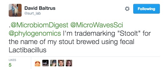- Stoolt, a bold Stout beer brewed using fecal Lactobacillus faecalifartensis isolated from David Baltrus.